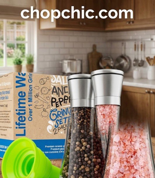 The Home EC Premium Stainless Steel Grinder Set isn’t trying to shake things up too much. It tries to fix the two most annoying things about regular wooden pepper grinders: the mess they make and how hard they are to refill.